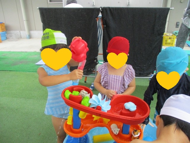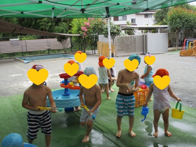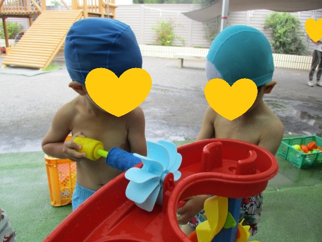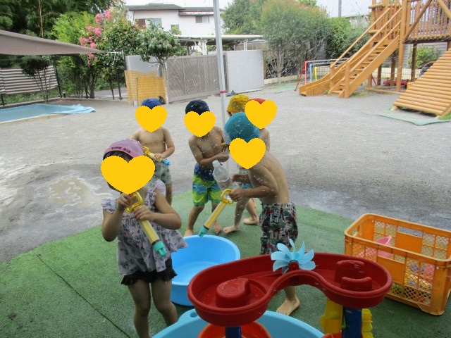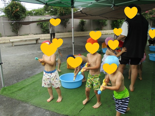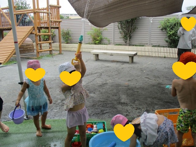 水鉄砲でお友だち同士水の掛け合いを楽しんでいます。
