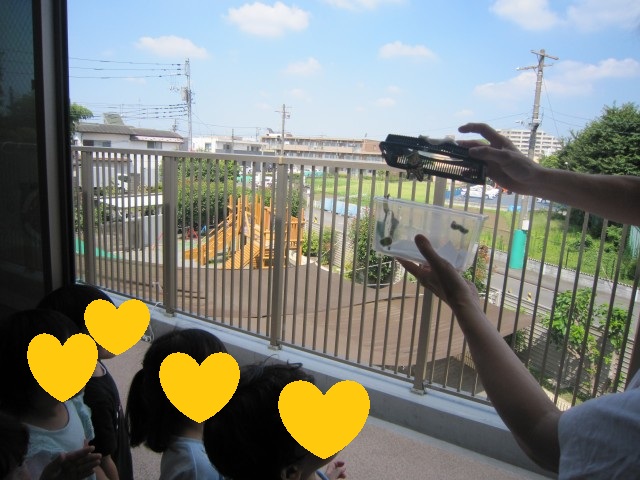 園庭の桑の木の伐採をしていたら、木の枝に大きな虫を発見!「うわ~!何の虫だ?」「この虫は何だろう?」