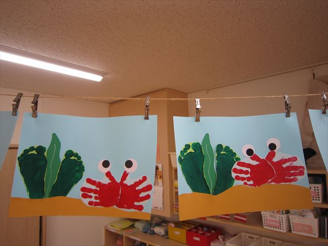 赤い手形は、カニに変身。緑の足形は、ワカメに変身。